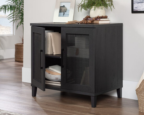 This Sauder 2-Door Library Storage Cabinet in Raven Oak is part of our Family Room collection. This item, SKU #433270, will make a great addition to your home. Any modern home office must have storage space. Add stylish and convenient storage to your workspace with this base cabinet from the Tiffin Line® collection. Use the top surface of this 2-door storage cabinet for a lamp, your binders, a planner, or use it as a space for your printer. A decorative rattan insert adorns the framed doors, giving the cabinet added style and eye appeal. The double doors conceal a spacious area that includes a large adjustable shelf for customizable storage options. You can stash books, papers, and other office essentials in this library cabinet all while utilizing as much space as possible. With impact resistant, high-grade thermoplastic edges, this library storage cabinet meets BIFMA testing standards for safety, durability, and structural performance. This item is finished on all sides for a polished look from every angle. Finished in a stunning, dark Raven Oak®, this office storage cabinet will add style and functionality to any environment. Order your 2-Door Library Storage Cabinet in Raven Oak from Express Furniture today!