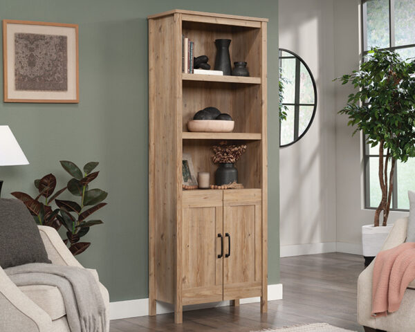 This Sauder 5-Shelf Bookcase with Doors in Khaki Pine is part of our Family Room collection. This item, SKU #434876, will make a great addition to your home. The 5-shelf bookcase from the Sauder Select collection offers the form and function of a library with a rustic flair. Finished in the natural woodgrain hues of Khaki Pine™, this farmhouse bookcase lends its country chic taste to anywhere you need storage and style. With three adjustable shelves (one behind the double doors), this bookcase with doors combines versatile storage options for your treasures of all shapes and sizes. Hold anything from vases of flowers to photo albums, a collection of novels, or vintage framed artwork that adds a little country charm. Concealed behind the two lower doors, this cottage bookcase offers another shelf for hidden storage – a perfect spot for a bin of seasonal décor, a collection of old VHS tapes, or a stack of family board games. Whether you have a veritable gallery of children’s artwork to present to the world, or a collection of priceless antiques, this display bookcase from Sauder is the perfect home to display your treasures. Order your 5-Shelf Bookcase with Doors in Khaki Pine from Express Furniture today!