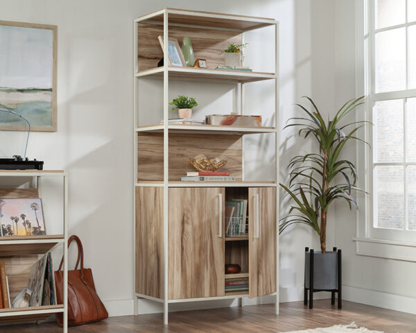 This Sauder 5-Shelf Bookcase with Doors in Kiln Acacia is part of our Family Room collection. This item, SKU #433801, will make a great addition to your home. Feature the décor you want to display while hiding the items you don’t, with this 5-shelf bookcase with doors. This versatile, open shelf bookcase provides efficient function and extensive storage simultaneously, with three spacious, open shelves that will make room for your vast selection of novels, binders, children’s books, photos, collection of figurines, awards, trophies, or anything you could ever want to display. Meanwhile, this storage bookcase with doors provides a hidden area with an adjustable shelf allowing versatile space for any non-display items of all shapes and sizes. The back panels are removable and adjustable, allowing for the expression of your personal style. Finished in Kiln Acacia and paired with a durable white powder coated metal frame, the natural and neutral finish provides the versatility to fit in to any home décor. This metal and wood bookcase is the additional storage solution you’ve been needing. Order your 5-Shelf Bookcase with Doors in Kiln Acacia from Express Furniture today!