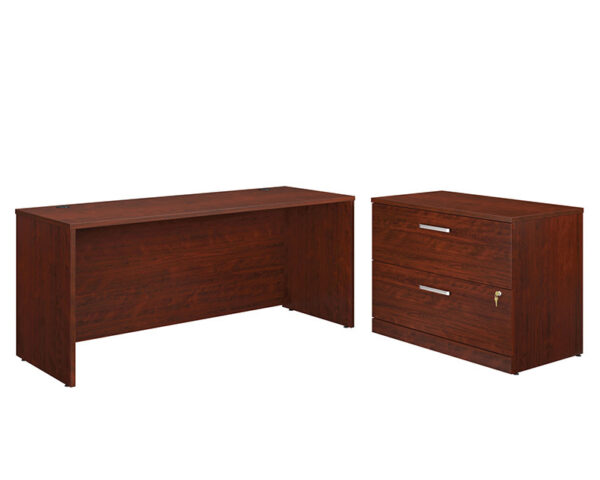 Express Furniture has updated its Commercial Office furniture line with this 72″ x 24″ Desk with Lateral File, SKU #430223. This bundle set includes 426276 72″ x 24″ Desk and 426162 Lateral File. 72″ x 24″ Desk features a durable, 1″ thick top for your computer, lamp, notebook and more. Melamine top surface is heat, stain, and scratch-resistant. Impact resistant, high-grade thermoplastic edges. Cord management system with two desk top grommet holes to keep your desk clutter free. Adjustable levelers to accommodate uneven flooring and alignment. Meets BIFMA standard x5. 5 for safety, durability, and structural performance. Finished in Classic Cherry®. Lateral File comes fully assembled (minimal hardware attachment required)Durable, 1″ thick top for display of photos, books, and more. Melamine top surface is heat, stain and scratch resistant. Impact resistant, high-grade thermoplastic edges. Drawers with full extension slides hold letter, legal or European size hanging files. Interlocking safety mechanism allows only one drawer open at a time. Drawers lock for secure storage of your most important files. Finished on all sides for versatile placement and a polished look. Adjustable levelers for optimal configurability. Meets BIFMA standard x5. 9 for safety, durability, and structural performance. Finished in Classic Cherry®.