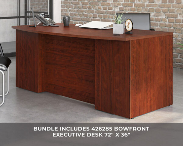 Express Furniture has updated its Commercial Office furniture line with this 72″ x 36″ 1-File Single Ped Bowfront Desk, SKU #430213. This bundle set includes 426285 Bowfront Executive Desk 72″ x 36″ and 426268 3-Drawer Mobile Pedestal. Bowfront Executive Desk 72″ x 36″ features durable, 1″ thick top for books, binders, a computer, and more. Melamine top surface is heat, stain, and scratch-resistant. Impact resistant, high-grade thermoplastic edges. Cord management system with two desk top grommet holes keep your desk clutter free. Adjustable levelers for optimal ergonomics and configurability. Meets BIFMA standard x5. 5 for safety, durability, and structural performance. Finished in Classic Cherry®. 3-Drawer Mobile Pedestal comes fully assembled (minimal hardware attachment required)Two small drawers with metal runners and safety stops for notepads, your planner, and more. Locking, lower drawer with full extension slides holds letter or European size hanging files. Interlocking safety mechanism prevents all drawers opening together. Hidden casters for easy mobility and option for rearrangement around the office. Finished on all sides for versatile placement and a polished look. Meets BIFMA standard x5. 9 for safety, durability, and structural performance. Finished in Classic Cherry®.