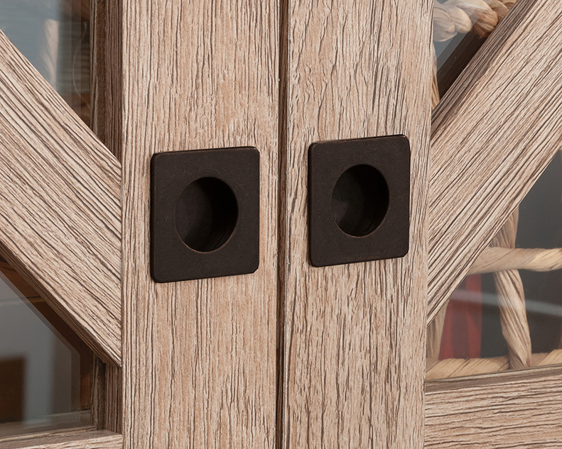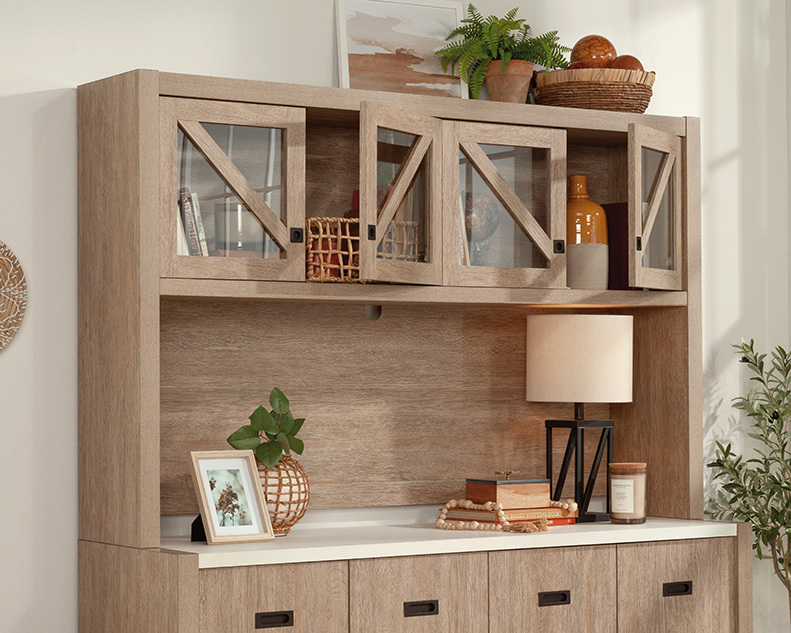 This Sauder Desktop Hutch with Doors in Brushed Oak is part of our Home Office collection. This item, SKU #432895, will make a great addition to your home. This office hutch with storage from the Dixon City® collection will be the contemporary country focal point of your office. Finished in the rustic, natural tones of Brushed Oak™, this desktop hutch with doors attaches to Credenza 432894, L-Shaped Desk 432896 or any combination of two of the following: Library Base 432888, Lateral File 431453 or Desk 432893. This residential office furniture has a strong and lightweight panel construction for easier portability and versatility, so you can mix and match among any of the combinations listed above. This hutch for desk includes diagonal trestle details at the top of the safety-tempered glass doors, behind which you will find spacious cabinets for all your storage needs. Cord management pass-throughs at the base of the hutch eliminates unsightly cord clutter. This commercial office storage hutch meets BIFMA standard x5. 9 for safety, durability, and structural performance. Contemporary style hardware in a rubbed bronze finish lends a touch of glam for a modern and glamorous appeal to complete the look of farmhouse luxury. Order your Desktop Hutch with Doors in Brushed Oak from Express Furniture today!