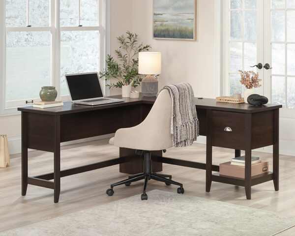 This Sauder L-Shaped Home Office Desk with Drawer is part of our Home Office collection. This item, SKU #435233, will make a great addition to your home. The L-shaped desk from the Summit Station® collection, crafted with a sturdy one-inch-thick desktop surface, is the epitome of durability and functionality. Organizing paperwork in this L-shaped computer desk is effortless with a file drawer equipped with full extension slides, accommodating letter-size hanging files. To maximize storage space, the home office L-shaped desk features a convenient lower shelf, perfect for keeping extra supplies or displaying decorative items. Its thoughtful design includes chamfered edges and tapered feet, adding a touch of elegance to any workspace. Versatility is evident, as the L-shaped desk with storage is finished on all sides, allowing you to place it anywhere that suits your needs. Managing cords is a breeze, thanks to the two desktop grommets provided. Additionally, the quick and easy assembly using the T-lock drawer system saves you valuable time. Enrobed in a rich, dark Cinnamon Cherry finish, this L-shaped desk with drawer not only elevates your productivity but enhances the aesthetics of your office or home. Order your L-Shaped Home Office Desk with Drawer from Express Furniture today!