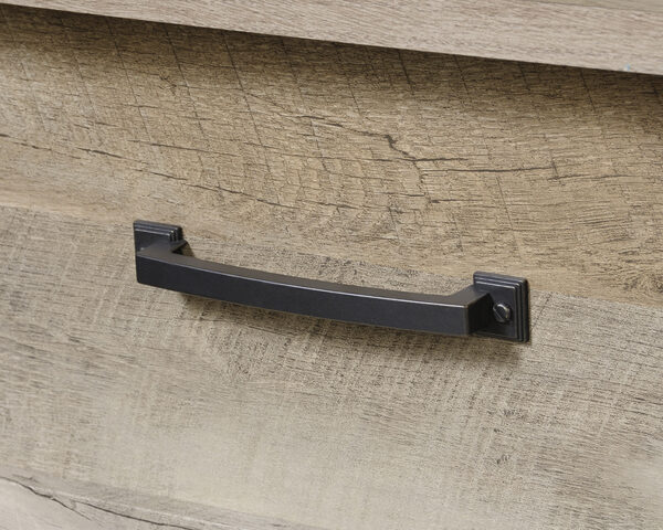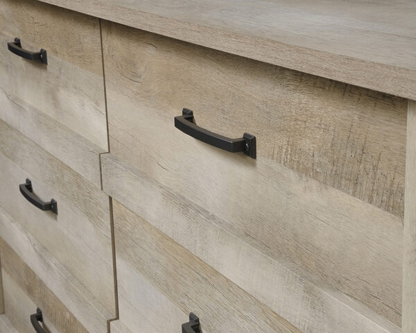 This Sauder Cannery Bridge® Dresser is part of Express Furniture’s Chests / Dressers offering. This item, SKU #419884, will make a great addition to your home. Enhance the look of your bedroom while adding versatile storage options with this 6-drawer dresser from the Cannery Bridge® collection. This handsome chest of drawers features six large drawers that open and close on smooth metal runners, making them ideal for convenient storage of anything from stacks of sweaters and denim jeans to your collection of t-shirts and pajama pants. It has room for all your stuff! Its spacious top surface provides you with ample amount of room for display of your favorite home décor items – an accent lamp, decorative candles, a mirror or photos of your family and friends. Its rustic charm and sleek design make this dresser a perfect fit for your bedroom. Finished in Lintel Oak® and accented with sleek black hardware, this handsome chest of drawers is the solution to all your storage woes and its sure to give your bedroom the instant country style makeover that it has been craving. Order your Sauder Cannery Bridge® Dresser from Express Furniture today!