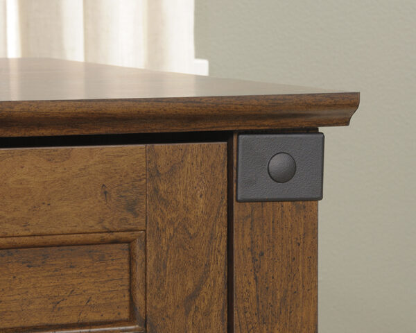 This Sauder Carson Forge® Corner Computer Desk is part of Express Furniture’s Computer Desks offering. This item, SKU #416969, will make a great addition to your home. Maximize the space in your home office or work space with this corner computer desk from the Carson Forge® collection. Its spacious table top surface provides you with ample amount of room for all your must-have desk essentials and more – laptop, pens and papers, important documents and even a little home décor. It features a slide-out keyboard/mouse shelf that opens and closes on smooth metal runners. It also includes three easy gliding storage drawers for easy access storage of miscellaneous office items. The lower drawer with full extension slides holds letter, legal or European size hanging files. Talk about organization! Behind the swinging door is a hidden area that includes an adjustable shelf and accommodates a vertical CPU tower. It also features a grommet hole so you can keep all your cords and wires neat and out of the way. Finished in Washington Cherry and accented with wrought iron style hardware, this beautiful desk has the style and functionality your home office needs. Order your Sauder Carson Forge® Corner Computer Desk from Express Furniture today!