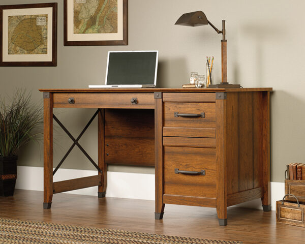 This Sauder Carson Forge® Desk is part of Express Furniture’s Computer Desks offering. This item, SKU #412920, will make a great addition to your home. Whether you’re looking for a place to get some work done or really just need another surface for your colossal penny collection, this desk from the Carson Forge® collection is perfect for you. This home office desk features three drawers that glide on smooth metal runners – each provides versatile storage for pens, pencils, notebooks, binders and more. The lower drawer holds letter-size hanging files to help keep your most important files organized and easy to find. The spacious top surface of this desk with storage is large enough for a computer, lamp, your planner, and more. Finished in a rustic Washington Cherry and accented with wrought iron style hardware, this desk hard is to take your eyes off of. We hope you like what you see. Sauder designers travel the world and bring back the best and latest in style, finish, and color trends. This inspiring world travel is evident in the cutting edge and innovative furniture solutions we offer to you! Order your Sauder Carson Forge® Desk from Express Furniture today!