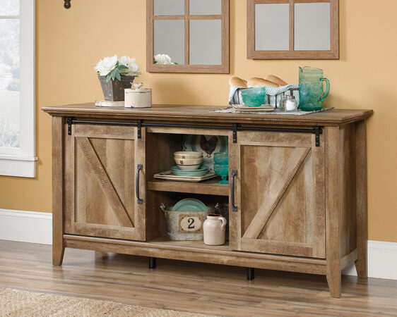 This Sauder Dakota Pass® Credenza is part of Express Furniture’s Tables / Carts offering. This item, SKU #420820, will make a great addition to your home. The television won’t be the only thing with all eyes on it when it sits on top of this credenza from the Dakota Pass® collection. It accommodates up to a 70” TV making it perfect for entertaining all your friends and family. It features three adjustable shelves and hidden storage behind each of the sliding doors for movies, games, and more! Finished in Craftsman Oak®, this TV stand will give your living room a stylish country upgrade. Order your Sauder Dakota Pass® Credenza from Express Furniture today!