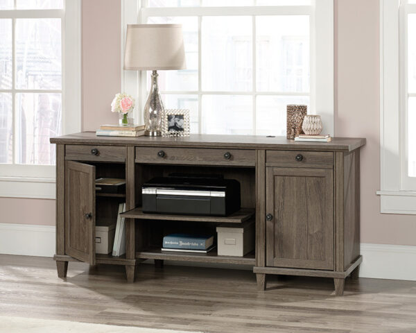 This Sauder Hammond® Credenza is part of Express Furniture’s Hutches/Credenzas offering. This item, SKU #423529, will make a great addition to your home. It’s time for a home interior upgrade! Give your living room the style it deserves while adding versatile storage and display with this credenza from the Hammond® collection. This stunning credenza features a durable, 1” thick top with a spacious surface to display your favorite home décor items such as decorative candles, sweet smelling potpourri, knick-knacks and framed photos too. It features three drawers with full extension slides for easy access storage of miscellaneous items like folders and pens. In the center, there is a pencil drawer for storage of your keyboard, mouse, or necessary writing utensils. Behind each of the framed panel doors is a hidden storage area that includes an adjustable shelf that can move to different heights for flexible storage of items of all shapes and sizes. This multipurpose desk also features a large, pull-out, adjustable printer shelf for convenient access to your printer or a place to store and display additional items. This good looking computer credenza also includes a cord management system with two desktop grommet holes. Finished in Emery Oak™ and detailed with attractive hardware, this one-of-a-kind credenza is everything you need and more. Order your Sauder Hammond® Credenza from Express Furniture today!