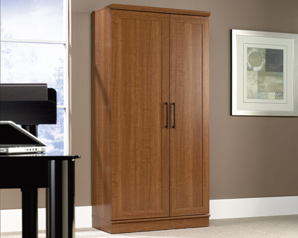 This Sauder storage cabinet offers you two adjustable shelves and one fixed shelf behind each door. The swing-out storage door on the storage cabinet features three adjustable and three fixed shelves. Unit can be assembled with swing-out storage on either left or right side. Framed panel doors. Enclosed back panel has cord access. Adjustable base levelers. Sienna Oak finish.