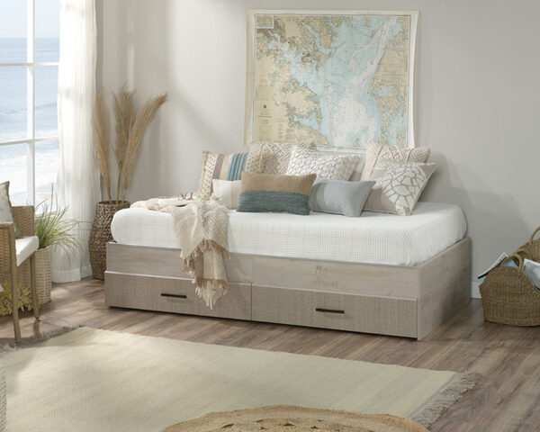 This Sauder Pacific View® Mate’s Bed/Day Bed is part of Express Furniture’s Beds / Headboards offering. This item, SKU #427049, will make a great addition to your home. There is nothing more luxurious than a guest room with a daybed. Okay, there may be a couple things that are more luxurious—but a daybed is still pretty nice. Add convenient sleep and storage space to any room with this twin daybed from the Pacific View® collection. This twin mates bed accommodates a twin-sized mattress for the kid’s room, a guest room, or as the perfect place to relax in a spare room. Daybeds with storage, like this one, feature convenient under the bed storage with two drawers for linens, toys, or extra craft supplies. This twin size daybed also includes casters on the drawers for easy mobility as your rearrange your home. The two drawers can be used on either side of the bed, or one on each side for versatile storage options, no matter how you position this mates bed in your home. This mates bed with storage features another perk: It can be easily disassembled. When you want to move your daybed between rooms, to another floors in your home, or to an entirely new location, you can do so with ease. Finished in a Chalked Chestnut® finish with Seagrass finish accents, this twin daybed with storage is the addition to any room you didn’t know you needed. Order your Sauder Pacific View® Mate’s Bed/Day Bed from Express Furniture today!