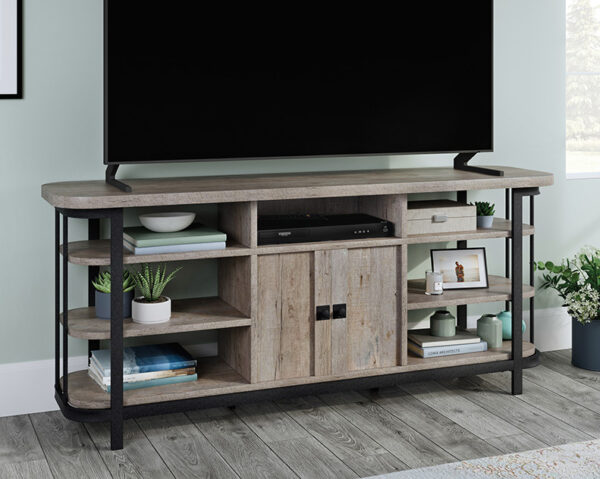 This Sauder Station House® TV Credenza with Shelves in Weathered Wood is part of our Station House® Credenzas/Cabinets collection. This item, SKU #433239, will make a great addition to your home. Add a touch of industrial-inspired style and design to your living room with this TV credenza from the Station House® collection. This credenza TV stand accommodates up to a 65” TV weighing 70 lbs. or less, making it the perfect spot to gather around with friends to watch the big game or play hours of video games. No need to worry about lack of space—this credenza with shelves features six open shelves for displaying home décor, books, greenery, or your audio/video equipment. A single cubby storage area creates additional space for photos of your family, remotes, and more. This modern credenza has a hidden storage area behind its doors that includes an adjustable shelf that can move to different heights to store items of all shapes and sizes. Attractive from every angle, this credenza cabinet is finished on all sides for versatile placement in any room of your home. Finished in Weathered Wood and detailed with a textured, powder-coated metal frame, this credenza is a strong statement piece for your living room. Order your Sauder Station House® TV Credenza with Shelves in Weathered Wood from Express Furniture today!