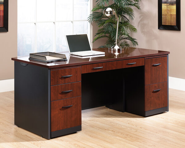 Attaches only to Executive Desk 401447 . Large drawer/shelf with metal runners and safety stops features flip-down panel for keyboard/mouse. Classic Cherry finish with Soft Black accents.