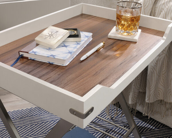 This Sauder Vista Key® Side Table is part of Express Furniture’s Accent Tables offering. This item, SKU #424180, will make a great addition to your home. Every couch deserves the perfect side table. Find a place for all your couch-side necessities with this tray top side table from the Vista Key® collection. This unique tray side table features a spacious, attached tray that provides you with the ideal amount of space for items like an accent lamp, the TV remote, coasters, and your refreshing cup of sweet lemonade. The tray doubles as a great spot to display home décor items like decorative plants, knick-knacks, and photos of your family. This tray end table features a metal frame and lower shelf in a brushed nickel finish. The lower shelf provides you with additional storage space for items like books and magazines. The attached tray is accented with metal corner brackets for an extra touch of detail that is sure to stand out. This side table is finished on all sides so it’ll look great from any angle in your home. Finished in Pearl Oak™ with Blaze Acacia® accents, this attractive side table with removable tray is just the right accompanying piece to complete your room. Order your Sauder Vista Key® Side Table from Express Furniture today!