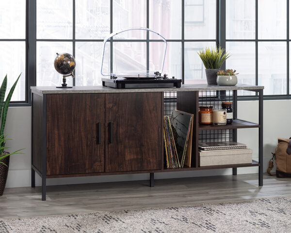 This Sauder TV Credenza in Rich Walnut with Slate Gray is part of our Family Room collection. This item, SKU #431217, will make a great addition to your home. With a wide range of uses, this TV credenza from the Market Commons® collection adds flair and storage in any room of your home. This credenza TV stand accommodates up to a 60″ TV weighing 70 lbs. or less, making it the place to gather around to watch the big game, the latest episode of your favorite TV show, or late-night movie showings. A large adjustable shelf behind the doors moves to different heights to accommodate items of various sizes. This credenza with shelves features open storage with vertical and horizontal options for different sized game consoles, audio/video equipment or décor. Accented with a wire mesh back, your equipment will have plenty of ventilated air movement, and a convenient path to navigate cords. Finished on all sides for versatile placement, this modern credenza will look polished from all angles. A Rich Walnut™ finish with Slate Gray accent, and a durable, powder coated metal frame make this credenza cabinet the multifunctional furniture addition to your home that you have been waiting for. Order your TV Credenza in Rich Walnut with Slate Gray from Express Furniture today!