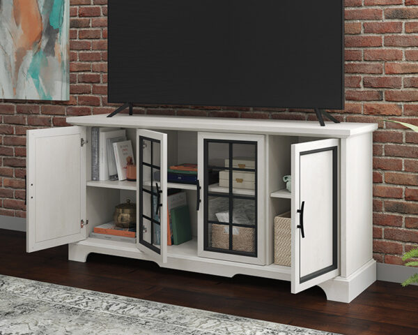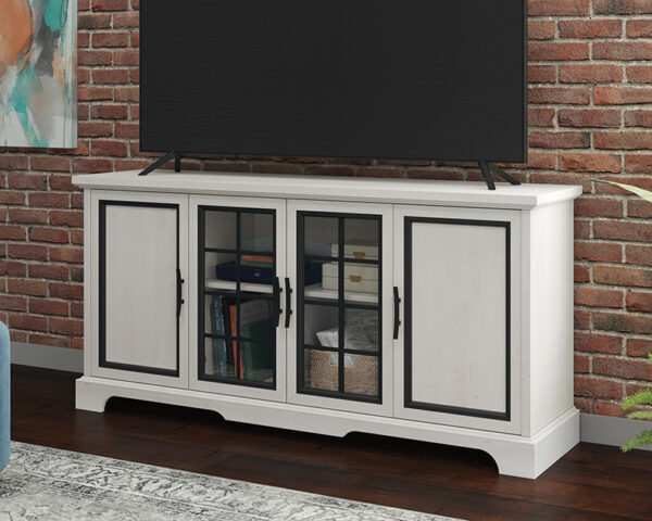 This Sauder TV Credenza with Doors in Winter Oak is part of our Family Room collection. This item, SKU #429544, will make a great addition to your home. For a credenza that is traditional, yet casual and modern, look no further than the distinct look of this credenza TV stand from the Carolina Grove™ collection. This substantial TV credenza with doors accommodates up to a 65″ TV weighing 95 lbs. or less on a strong and lightweight 1″ thick top panel. Make your home the perfect place to watch weekly sporting events, the latest streaming series, or your favorite nightly game show. This entertainment credenza includes four doors – including two safety-tempered glass doors in the center console. Storage behind the glass doors includes a large shelf for audio/video equipment and two cubby areas. Additional storage behind the other two doors includes an adjustable shelf for versatile housing of those living room essentials you want to hide away. This TV stand with doors is equipped with an enclosed back panel with cord access to help keep the cables out of sight and clutter-free. Finished all over in light Winter Oak®, the doors are decoratively accented with contrasting black hardware and outlines. A TV cabinet with doors, like this one, offers enough storage and style to make it the perfect focal point in any living room. Order your TV Credenza with Doors in Winter Oak from Express Furniture today!